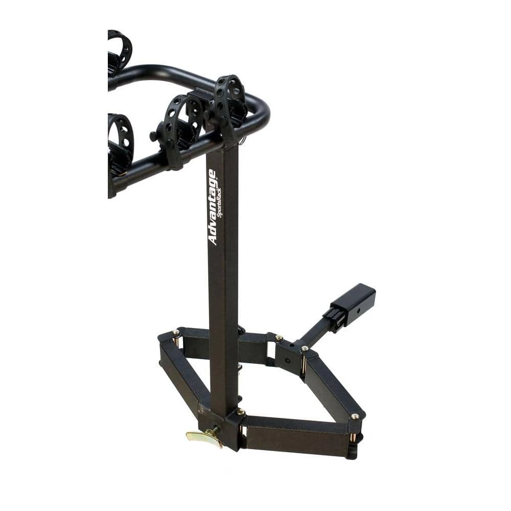 The Heininger Advantage SportsRack glideAWAY2 Deluxe 4 Bike Carrier is a rear oriented bike carrier for vehicles utilizing hitch receivers that allows full access to the rear interior of the vehicle without the necessity of removing the bikes. Designed around an accordion style folding mechanism, when need be the glideAWAY2 deluxe can extend up to 23 inches away from its locked position close to the vehicle. This makes it perfect for use with hatchbacks. It can also swivel either left or right when extended, allowing for even more space to reach cargo. The glideAWAY2 utilizes an anti-wobble device and an adapter to fit both 2 in. and 1.25 in. hitch receiver sizes. The glideAWAY2 deluxe 4 bike carrier eliminates the agony and irritation often experienced with other rear mounted carriers of having to take your bikes off every time you want access to your vehicle from the back. Designed to hold up to four bicycles with 1-2 in. top frame tubes. The ingenuous accordion style folding arm construction of the glideAWAY2 allows it to be pulled away from your vehicle with the simple lifting of the handle of its spring loaded safety latch, located behind its main upright support post. This instant 23 in. of additional space gives you easy, convenient access to the cargo area of your vehicle anytime you need it. When finished with cargo the glideAWAY2 pops easily back into a secure locked position.