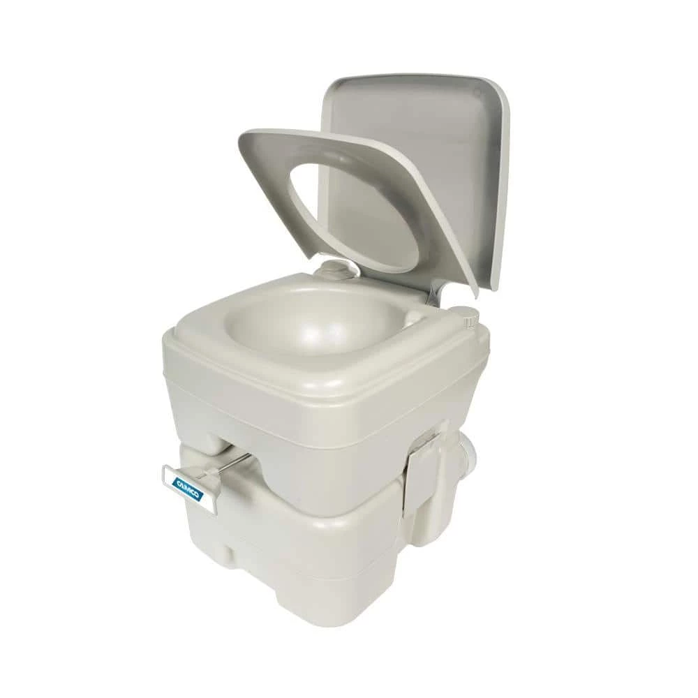 Camco’s 5.3 Gal. portable toilet is designed for camping, Rving, boating or any other recreational activity. Its sturdy polyethylene construction is compact and lightweight. The 5.3 Gal. holding tank is detachable and includes a sealing slide valve to lock in odors and protect against leakage. It includes 2 side latches to secure the tank to the toilet and a carrying handle for easy transport. The toilet employs an easy to use bellow-type flush and pulls slide valve for easy flushing. The toilet measures 16.38 in. H x 13.75 in. W x 16.13 in. D. It weighs 11.5 lbs. empty. Included is a packet of Camco’s TST biodegradable toilet chemical. Please note: Total Seat Width is 13 in. Seat dimensions (inside) are: 8.5 in. W x 9 in. D.