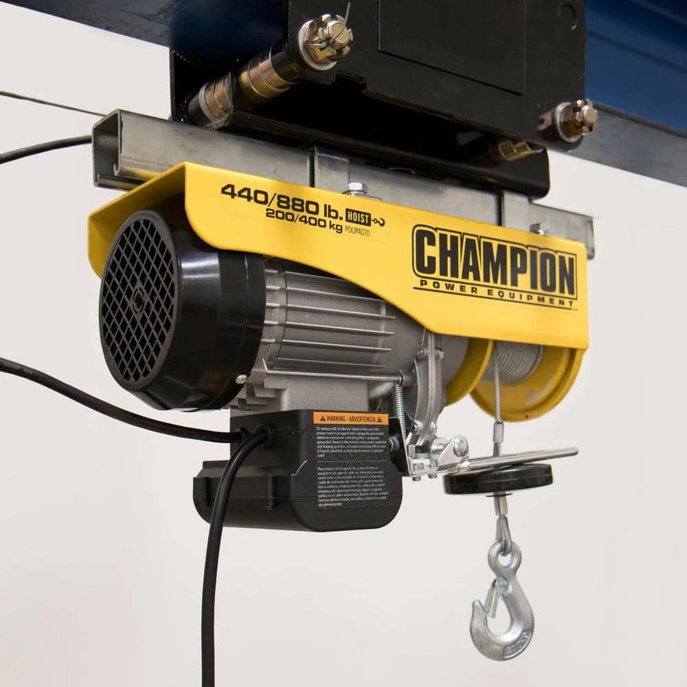 The Champion Power Equipment 18890 440/880-lb. Automatic Electric Hoist is designed for powerful and reliable lifting of small engines, transmissions, large shop tools and more – perfect for the garage, shop, farm or job site. The 850 Watt electric motor is powerful enough to make this hoist the perfect solution for lifting heavy engines, bulky loads, heavy building materials, tools or machinery. Champion includes everything you need to get started hoisting – the electric hoist with stop bracket and line blocker, the durable 39.4 ft. wire cable and the heavy-duty, handheld tethered remote control for easy and safe operation. Designed for safety, the stop bracket automatically shuts down the hoist if the line blocker begins to pull it upwards. This prevents the wire cable from retracting too far on the spool and damaging the spool, cable or hoist. Champion also includes a handheld, tethered remote control, which allows you to operate the hoist safely and easily. Choose single-line capacity, and lift up to 440 lbs. at a rate of 33 ft. per minute. With double-line capacity, this hoist can lift up to 880 lbs. at a rate of 16 ft. per minute with the included pulley hook. Your days of hand cranking and manual operation are over once you own this powerful electric hoist. Champion Support and our nationwide network of service centers will back up your purchase with a 2-year limited warranty and free lifetime technical support.