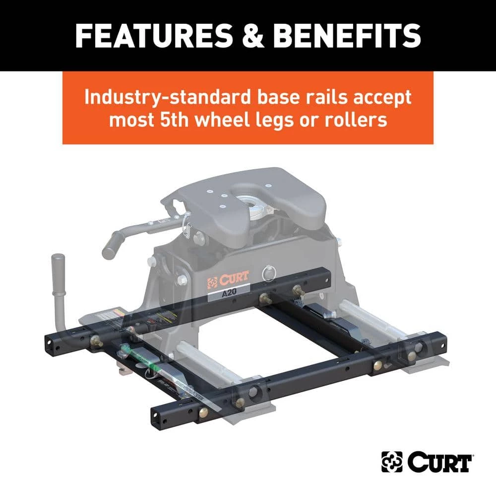 The CURT OEM puck system 5th wheel adapter for Chevy, Ford and GMC pickups combines the functionality of CURT 5th wheel puck system products with the strength and convenience of the truck bed puck system. The adapter provides a set of industry-standard 5th wheel rails to securely mount a CURT 5th wheel hitch or roller into the bed of your truck. It is designed to fit select model years of the Chevrolet Silverado, GMC Sierra 2500 HD and 3500 HD and Ford F-250 and F-350 Super Duty (see application info to verify fitment). It features a set of adjustable, quarter-turn anchors to quickly and easily drop into the pucks and provide a moveable platform for the 5th wheel coupling point. This puck system adapter requires a specific puck system for installation (year range specific). It features a capacity of 25,000 lbs. and is compatible with all CURT 5th wheel legs and rollers (weight capacities are limited to the lowest-rated towing component).