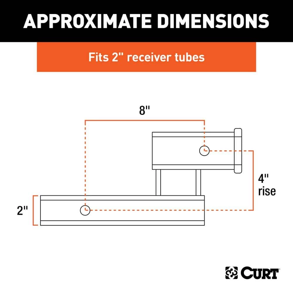 CURT hitch adapters and extenders are easy to use and help provide level towing for your trailer. This receiver hitch adapter is designed to fit a 2 in. x 2 in. receiver tube opening. It not only extends the receiver but also provides 4 in. of drop or 4 in. of rise. It is great for adjusting the height of a ball mount, bike rack or other hitch accessories. It has a max weight capacity of 7,500 lbs. This raised hitch adapter extension is also ideal for dinghy towing, allowing you to level your tow bar with the vehicle base plates. CURT hitch adapters are crafted to be durable and dependable. This drop down hitch adapter features a strong steel construction, precise welding and a durable black powder coat finish for lasting resistance against rust, chipping and UV damage.