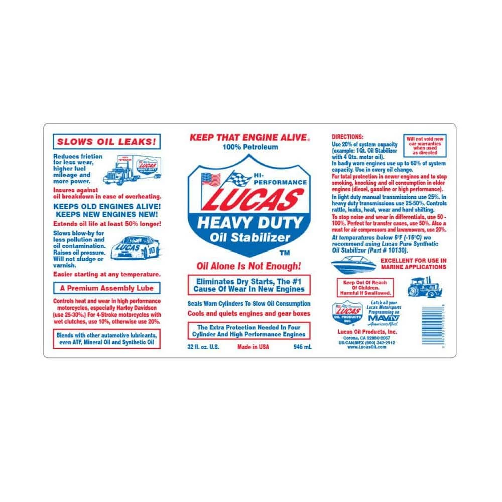 A pure petroleum multi-use oil supplement. Controls noise, heat and wear in manual transmissions and differentials. Number one in the heavy duty and high performance industries. Lucas Oil Stabilizer is a 100% petroleum product formulated to eliminate dry starts and reduce friction, heat and wear in any type of engine. It allows motor oils a higher degree of lubricity which reduces oil consumption and operating temperatures. Use Lucas Oil Stabilizer in gear oil to stop leaks, reduce operating temperatures and increase the life of the gear oil. Since it is pure petroleum, it can safely blend with all other automotive lubricants, even synthetics, ATF and mineral oil. It keeps old engines alive and new engines new. In Ford Powerstrokes we suggest one quart of Pure Synthetic Oil Stabilizer per oil change.