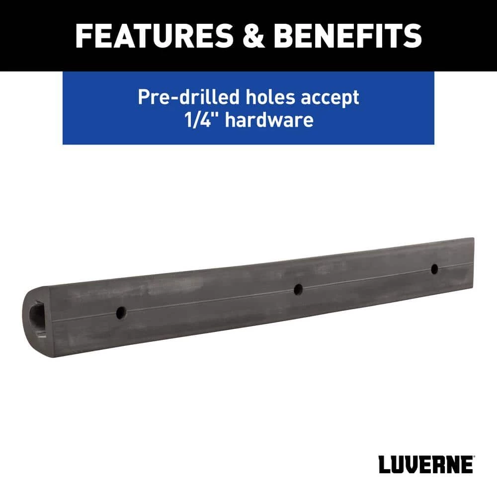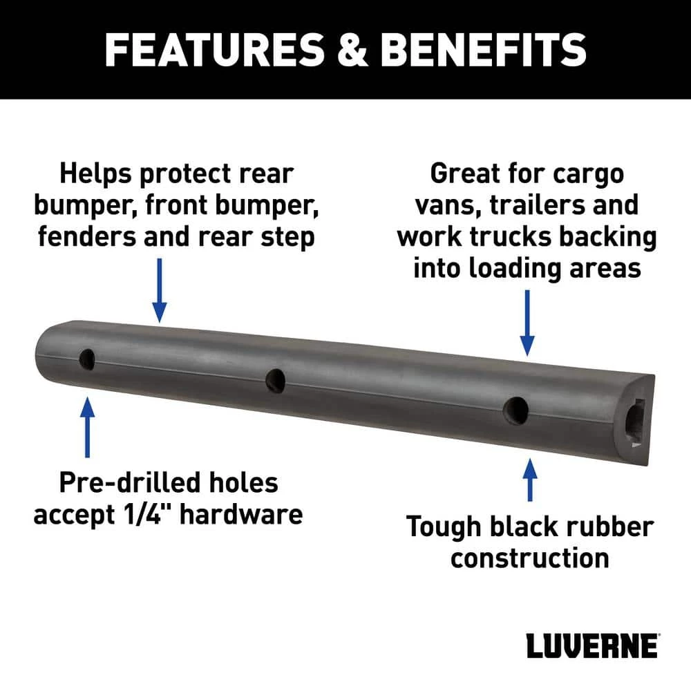 The Luverne rear rubber bumper protector is ideal for work vans, delivery vans, trailers and commercial trucks that frequently back into loading areas or work spaces. The 2-1/8 in. x 1-7/8-in. x 20 in. L rubber bumper strip helps protect the vehicle’s rear bumper, rear step, sides or even the front bumper. It is intended to be a universal rubber bumper guard, featuring 3 pre-drilled holes to accept 1/4 in. hardware. Mounting hardware is not included with this piece, and drilling into the attachment surface may be required for proper installation.