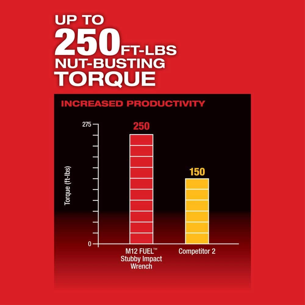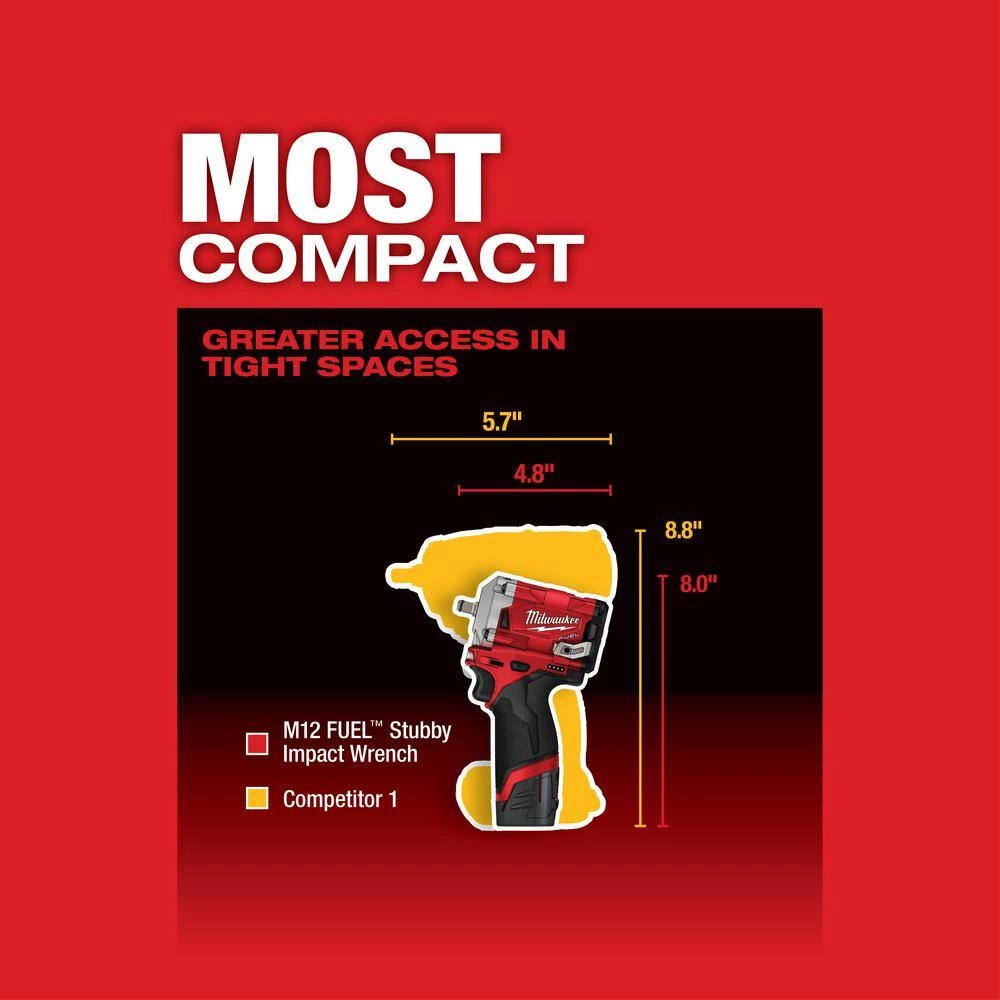 The Milwaukee M12 Cordless Grease Gun Kit delivers the highest max operating pressure in its class to help users handle heavy-duty applications and eliminate downtime. The M12 REDLITHIUM battery lets users dispense up to 7 grease cartridges per charge, providing up to 25% more pressure and more than 8,000 PSI operating pressure for heavy machinery, cold weather applications and clogged grease fittings. The cordless grease gun has a lightweight, ergonomic handle that offers users greater comfort during prolonged use and an onboard hose storage and shoulder strap for convenience with less mess. This kit comes with one 12-Volt extended capacity battery, a 60-minute charger, 36 in. flex hose with spring guard, grease coupler and carrying case. The M12 FUEL Cordless Brushless 3/8 in. Stubby Impact Wrench is the industries most compact impact wrench on the market place. Measuring only 4.8 in. L, this tool fits in tighter spaces, making users more productive. Increased torque delivers an industry leading 250 ft.-lbs. of breakaway torque, removing even the most stubborn bolts and fasteners. 4-Mode Drive Control, will allow unmatched control in various fastening applications. 1-3 RPM allows for precision control, and Auto-Shut Off Mode in the 4th setting will prevent over fastening of bolts while doing reassembly work.