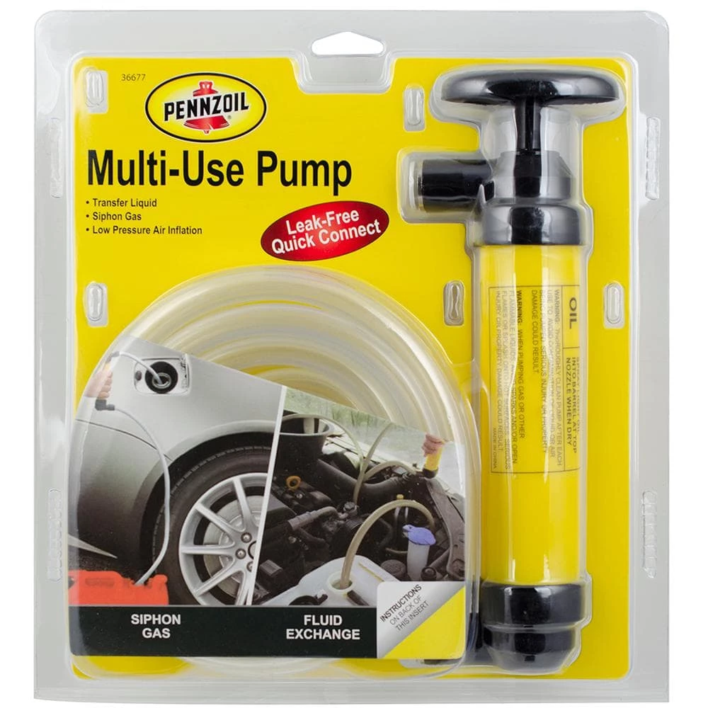 This Pennzoil Brand transfer pump works with any low-viscosity fluid to fill or empty engines, tanks and more. The long hoses give you plenty of distance to work and the molded handle allows for comfortable manual pumping. The included inflation needle transforms this pump into an air pump to inflate tires on bikes or cars. This transfer pump is also ideal for changing oil, siphoning gas and most fluid related maintenance.