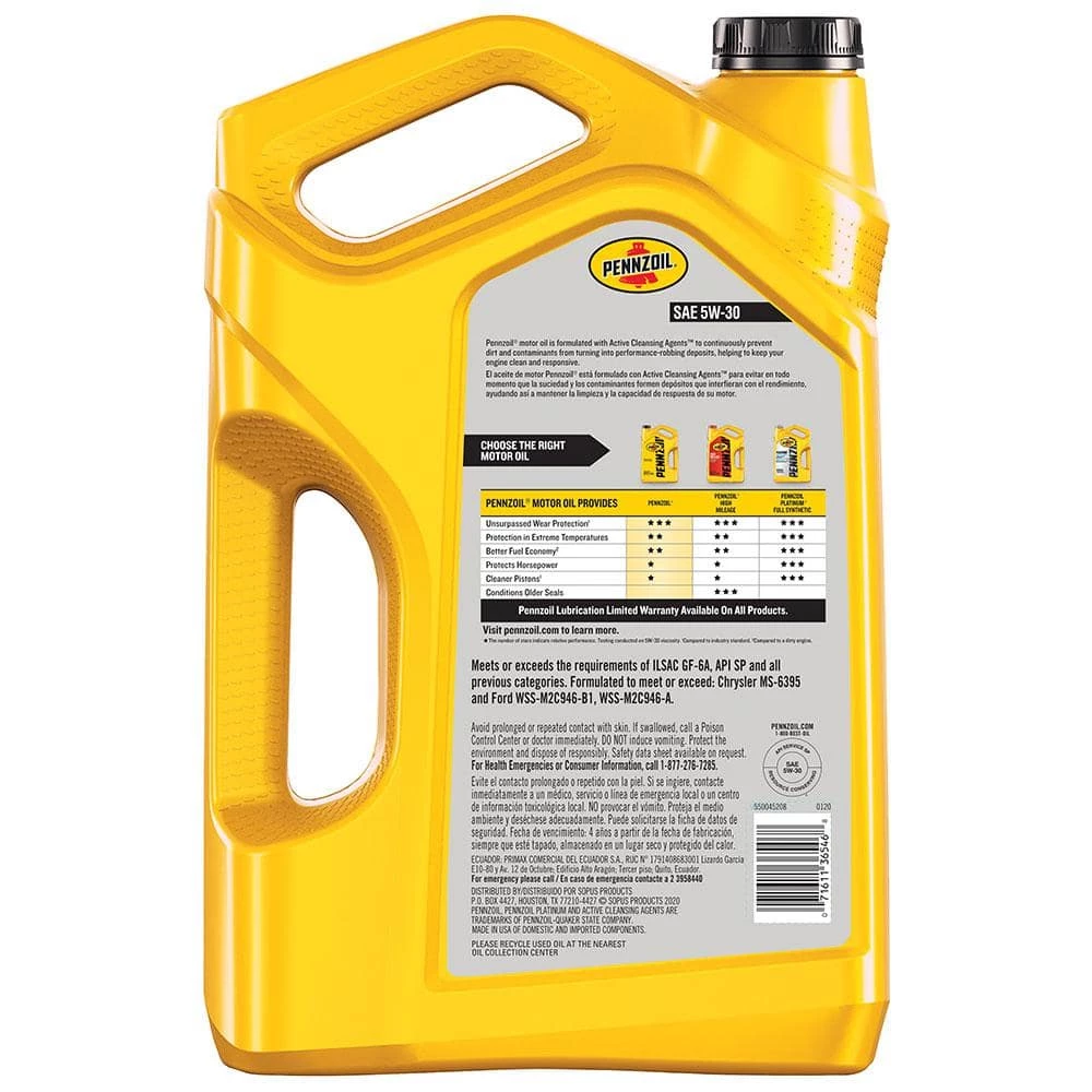 Pennzoil motor oil exceeds the toughest industry standards based on ILSAC GF-6 and API SP and is engineered to help prevent sludge and other damaging deposits in your engine. It provides a balance between reducing frictional losses and protection against harmful engine wear by getting between moving parts to prevent friction. No other leading motor oil provides better wear protection than Pennzoil motor oil (based on Sequence IVA wear test using SAE 5W-30). Pennzoil SAE 5W-30 is a synthetic blend oil, formulated to provide protection against the harmful effects of stop-and-go driving and low-speed pre-ignition (LSPI) in modern turbocharged engines.