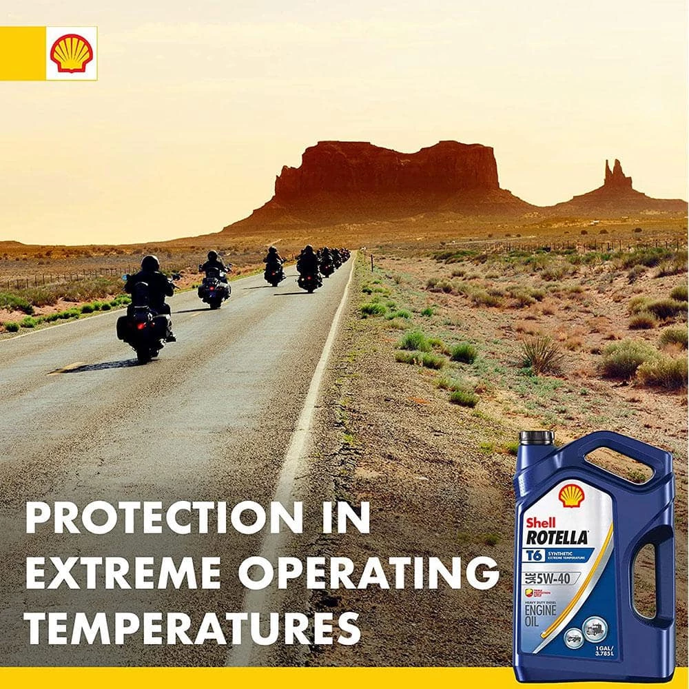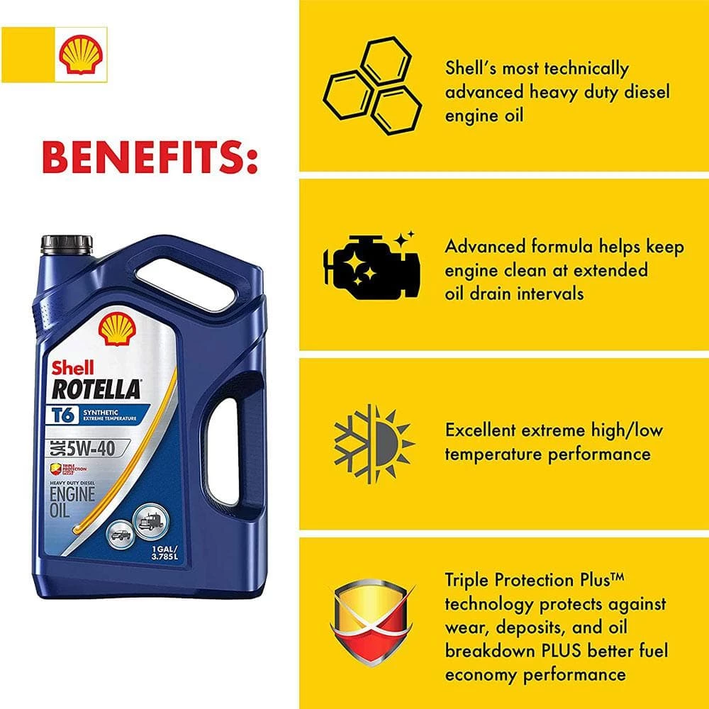 - Shell Rotella T6 synthetic oil resists breakdown by heat to provide continuous protection throughout the service interval