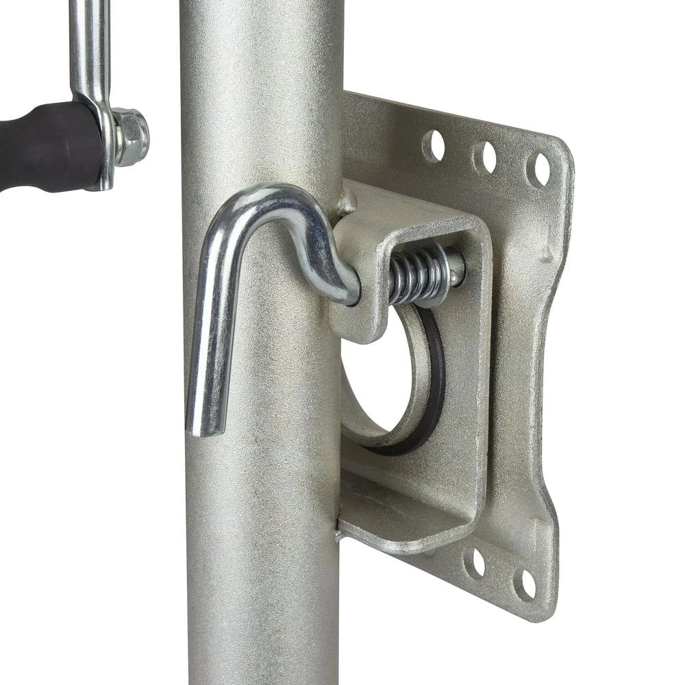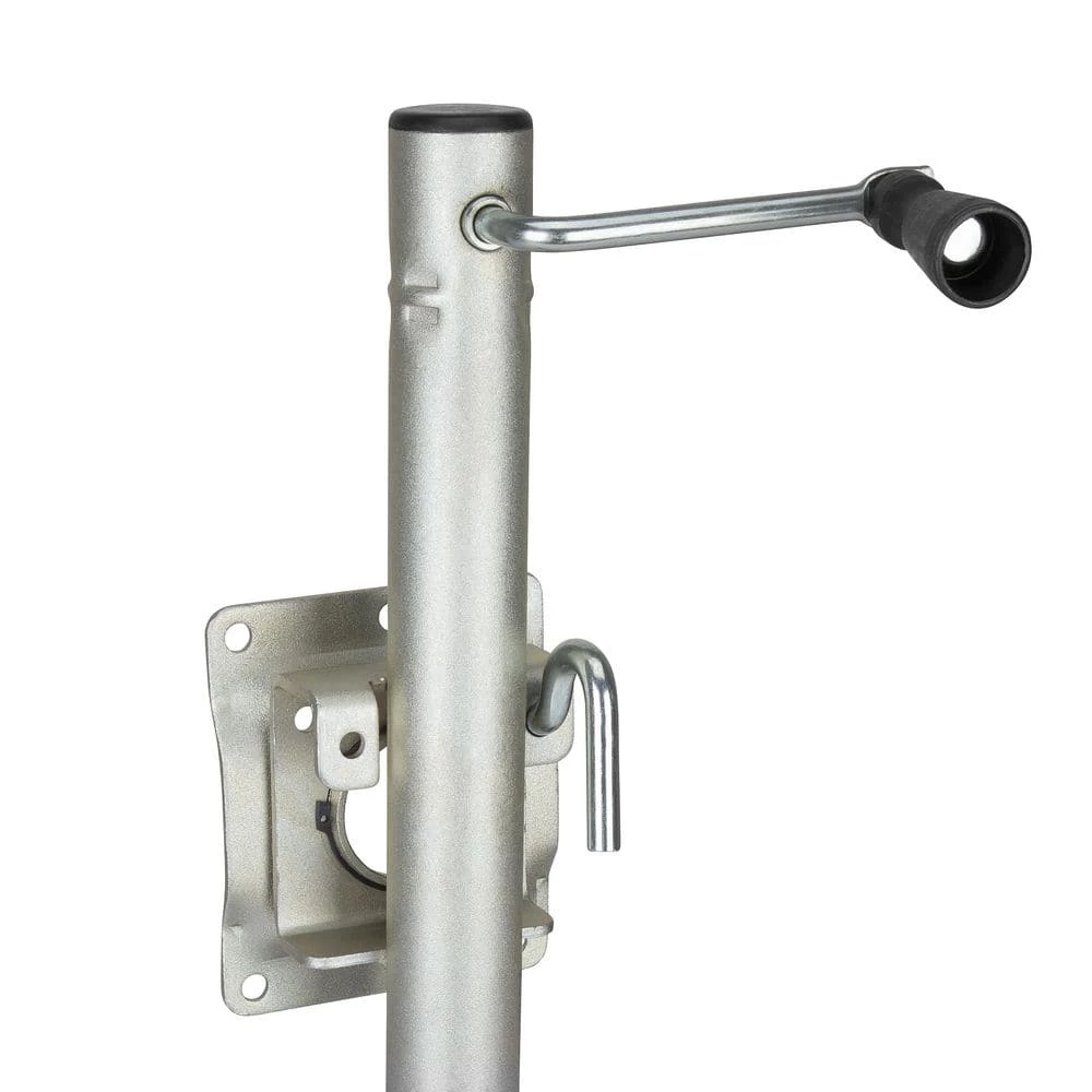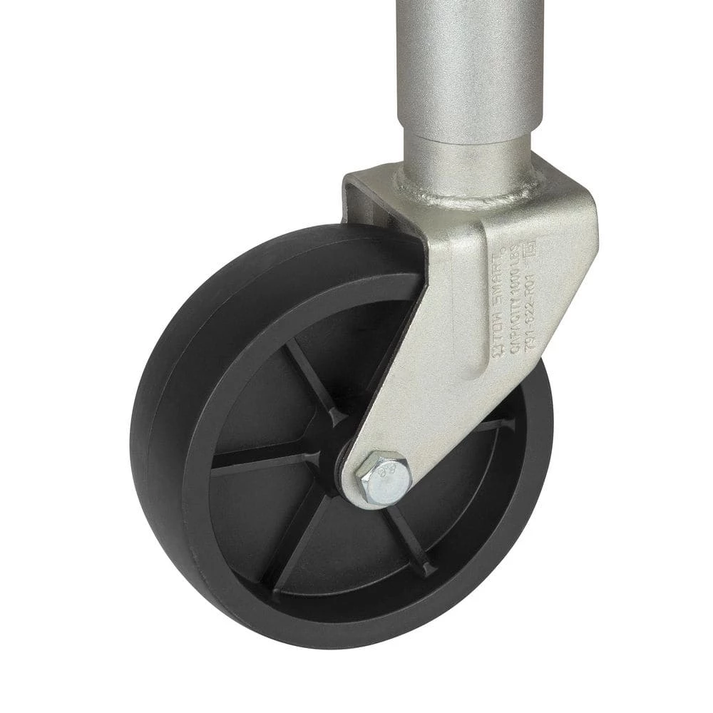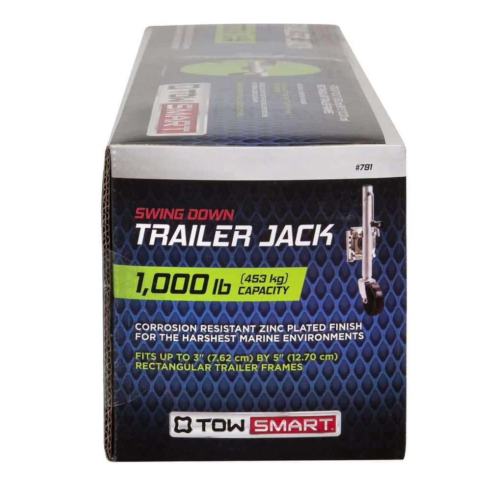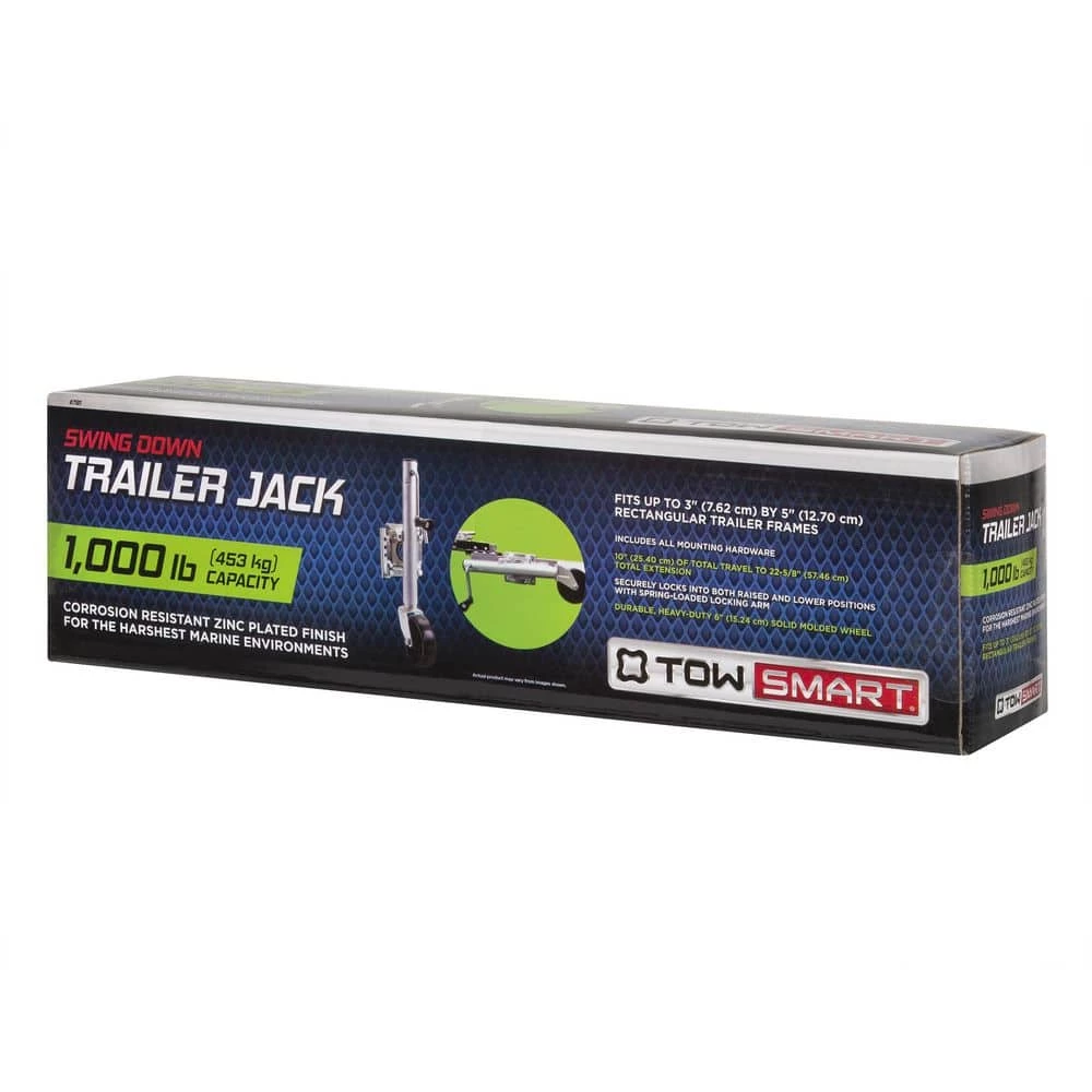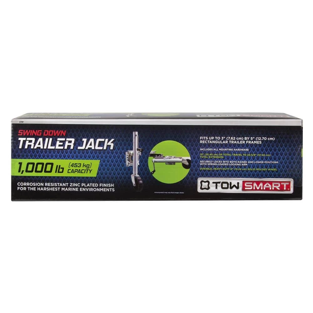The TowSmart Swivel Swing down Trailer Jack features a corrosion-resistant zinc-plated finish for the harshest marine environments. It will securely lock into both raised and lower positions with a spring-loaded locking arm. It also features a durable heavy-duty solid molded wheel and all mounting hardware.