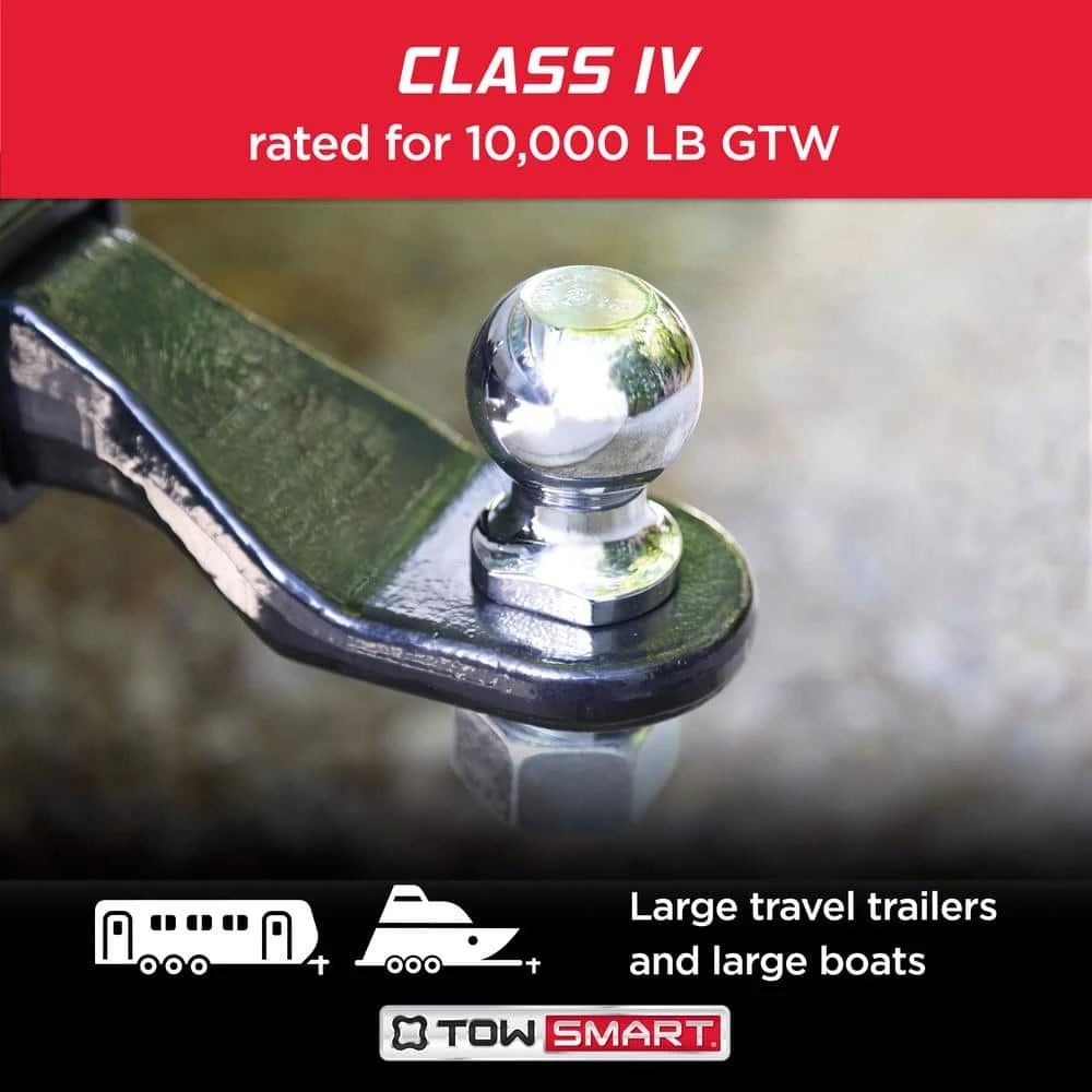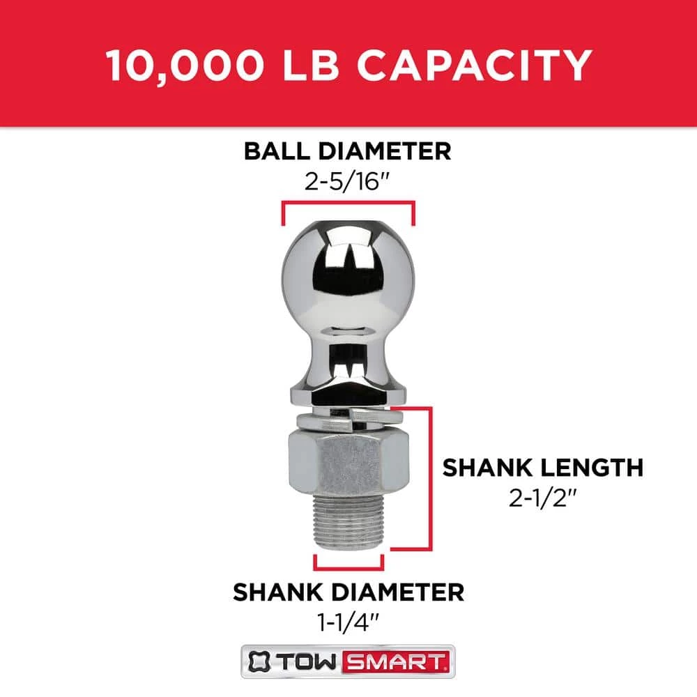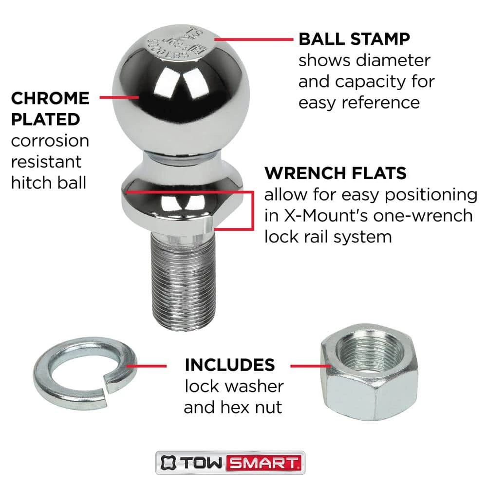 The TowSmart Hitch Ball is a key component to create a secure connection between your vehicle and trailer when towing your valuable assets. The heavy-duty construction is extremely durable with a chrome plated finish that is corrosion resistant. The hitch ball provides wrench flats for easy positioning in the X-Mount lockrail system. The lockrail functions as a built-in wrench preventing hitch ball rotation during installation or removal. The wrench flat design is universal to be used with any standard ball mount. It is important to know the total weight of the trailer (GTW) you are towing and the maximum towing capacity determined by the vehicle manufacturer.