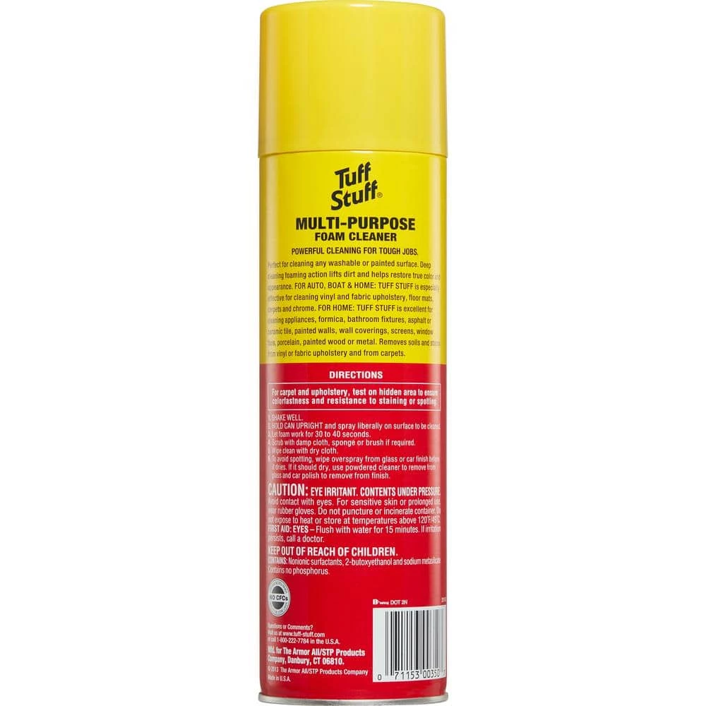 Tuff Stuff Multi-Purpose Foam Cleaner offers powerful cleaning for tough jobs on a variety of surfaces. Thick foaming action helps to lift dirt off almost any surface for a versatile interior car cleaner. Use this multi-purpose cleaner as a carpet cleaning foam, fabric cleaner, vinyl cleaner or car upholstery cleaner. Simply spray the car interior cleaner on dirty or stained surfaces and let it work for 30 to 40 seconds. Scrub the area if needed and wipe away the carpet wash and car seat cleaner with a clean cloth. It also works in your garage or home on painted walls, tile and floors.