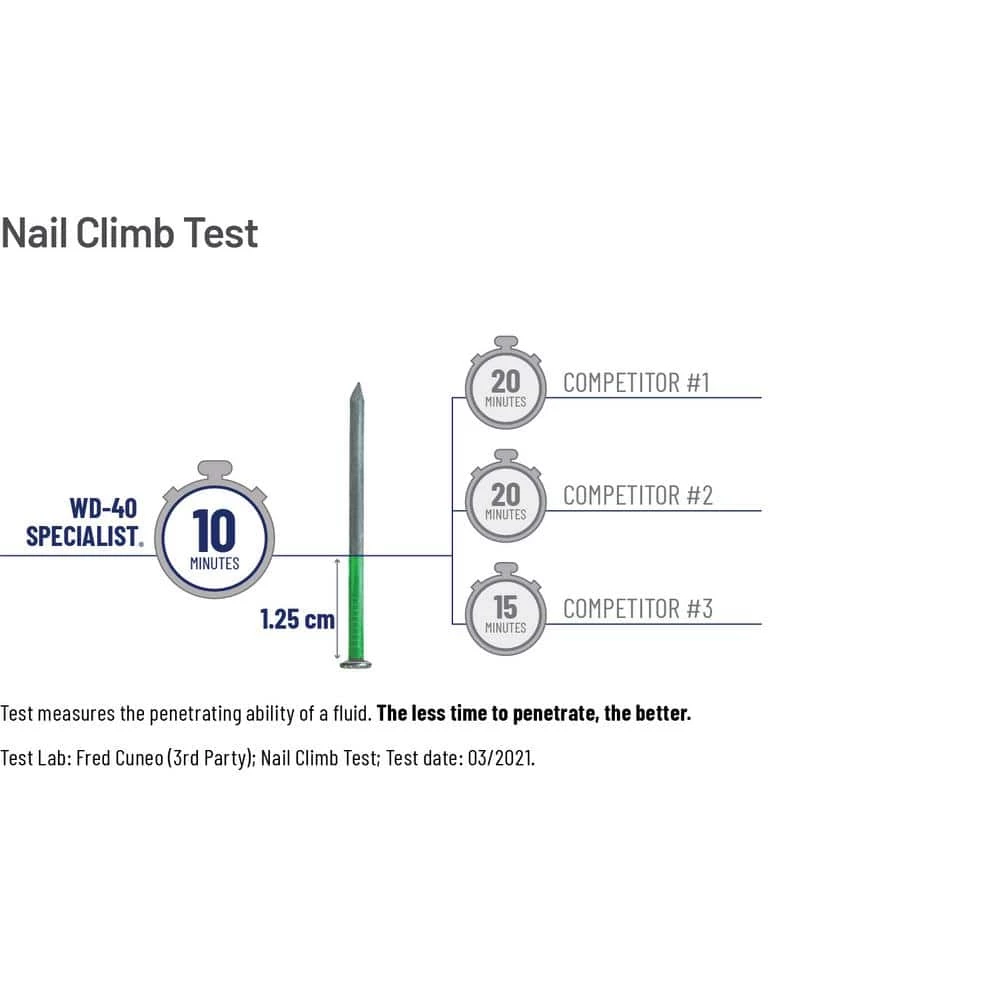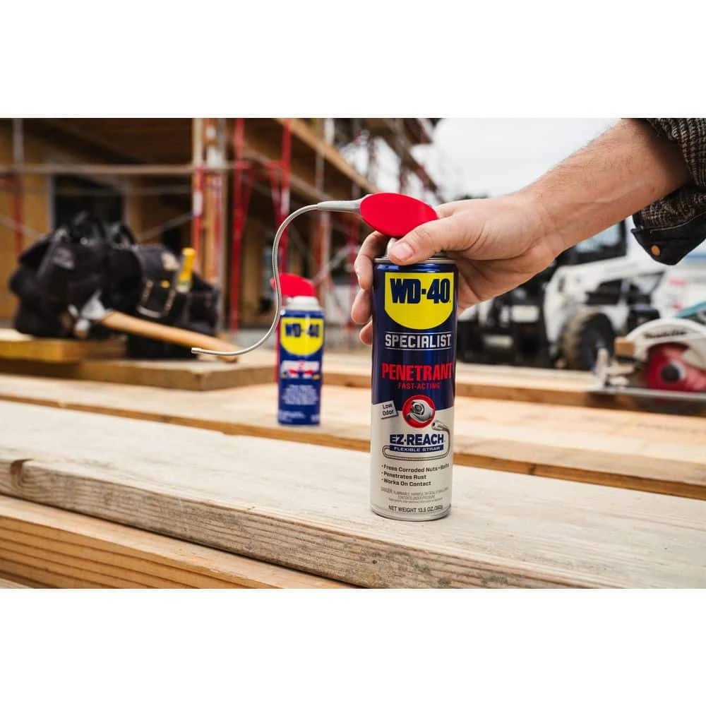 WD-40 Specialist Penetrant is a fast-acting penetrant with capillary action to penetrate deep into crevices, threads and seams to break the rust bonds that hold stuck parts together. It is a low odor formula that works on contact to free rusted nuts, bolts, threads, locks, and chains leaving behind a protective layer that prevents rust and corrosion from re-forming. Now the job is even easier with our proprietary 8″ flexible straw that bends and keeps its shape, allowing unlimited access to hard-to-reach places. Penetrates up to 2x faster than the competition*. Prevents rust 10x longer than the competition**. Penetrates rust to free up stuck, frozen, or seized equipment and parts. Safe to use on metal, rubber and plastic parts. Ideal for use on nuts, bolts, threads and locks. 50-state VOC compliant. * Test Lab: Fred Cuneo (3rd Party); Nail Climb Test; Test date: 03/2021. ** Test Lab: WD-40 Co. Technical Center (Pine Brook, NJ); ASTM B117; Test date: 02/2021.